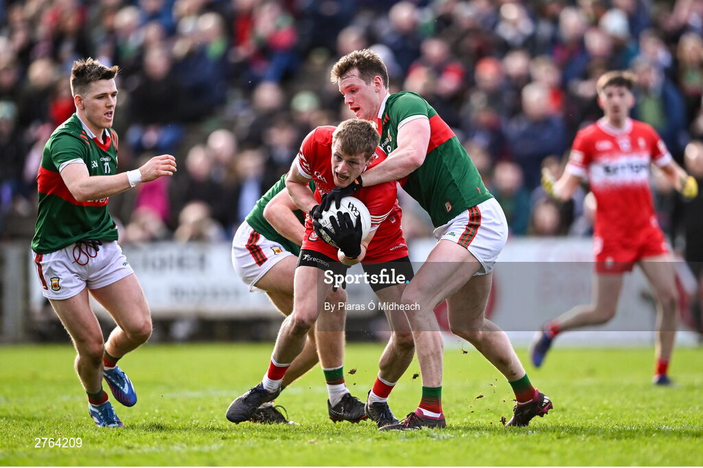 17 March 2024; Brendan Rogers of Derry in action against Matthew Ruane of Mayo, right, during the Allianz Football League Division 1 match between Mayo and Derry at Hastings Insurance MacHale Park in Castlebar, Mayo. Photo by Piaras Ó Mídheach/Sportsfile