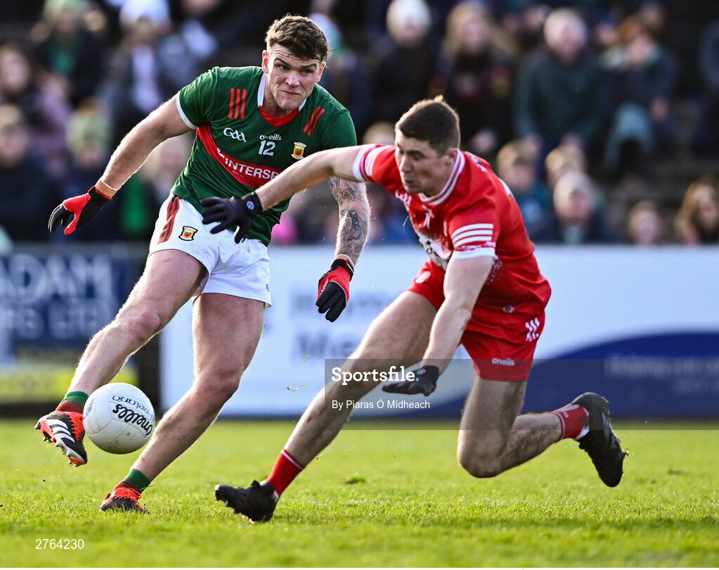 17 March 2024; Jordan Flynn of Mayo in action against Ciarán McFaul of Derry during the Allianz Football League Division 1 match between Mayo and Derry at Hastings Insurance MacHale Park in Castlebar, Mayo. Photo by Piaras Ó Mídheach/Sportsfile
