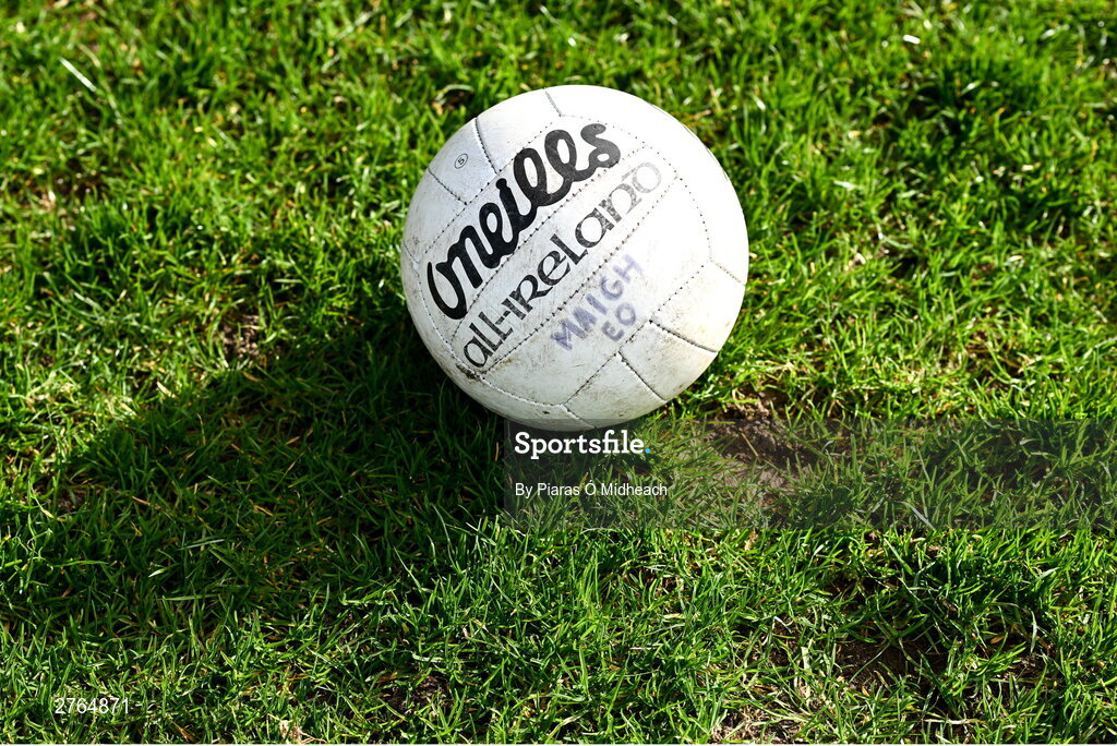 17 March 2024; A footballs on the pitch for the Mayo warm-up before the Allianz Football League Division 1 match between Mayo and Derry at Hastings Insurance MacHale Park in Castlebar, Mayo. Photo by Piaras Ó Mídheach/Sportsfile