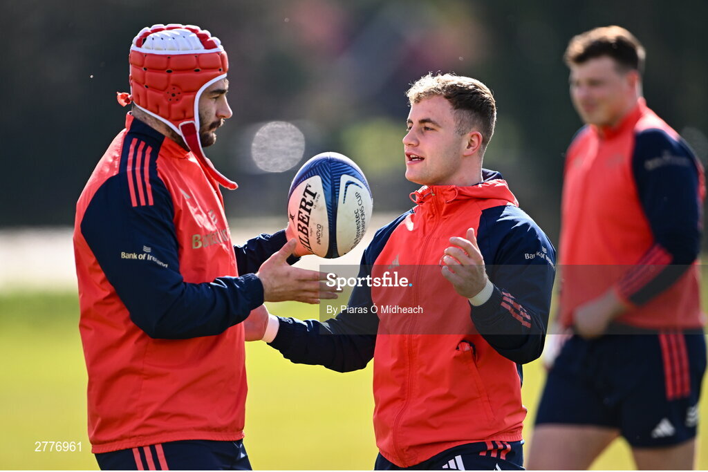 3 April 2024; John Hodnett, left, and Craig Casey during Munster rugby squad training at University of Limerick in Limerick. Photo by Piaras Ó Mídheach/Sportsfile
