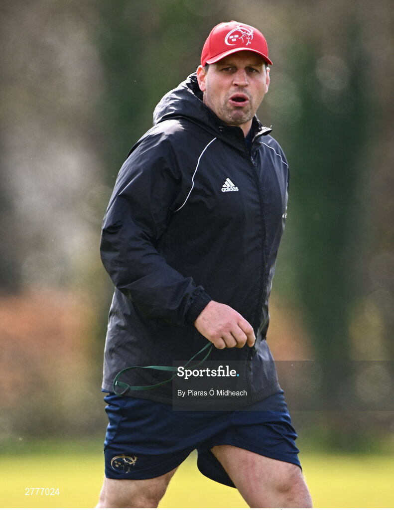 3 April 2024; Defence coach Denis Leamy during Munster rugby squad training at University of Limerick in Limerick. Photo by Piaras Ó Mídheach/Sportsfile