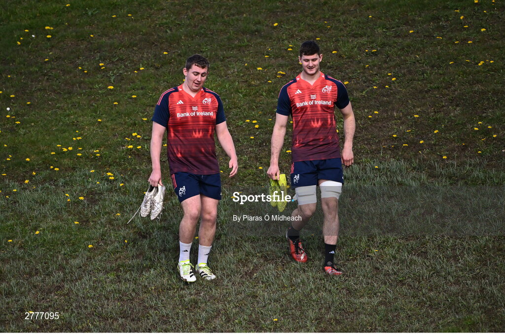 3 April 2024; Darragh McSweeney, left, and Evan O'Connell arrive for Munster rugby squad training at University of Limerick in Limerick. Photo by Piaras Ó Mídheach/Sportsfile