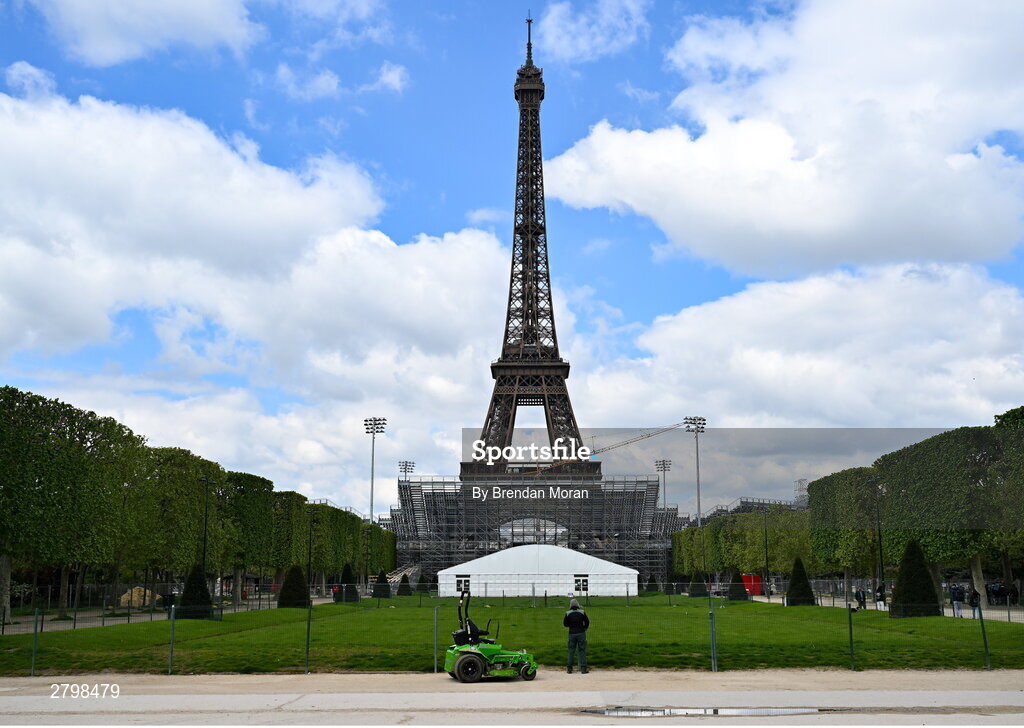 18 April 2024; Construction of stands at the Eiffel Tower Stadium that will host the Beach Volleyball and Men's Blind Football competitions continues ahead of the XXXIII Summer Olympic Games which takes place in July and August in France. Photo by Brendan Moran/Sportsfile