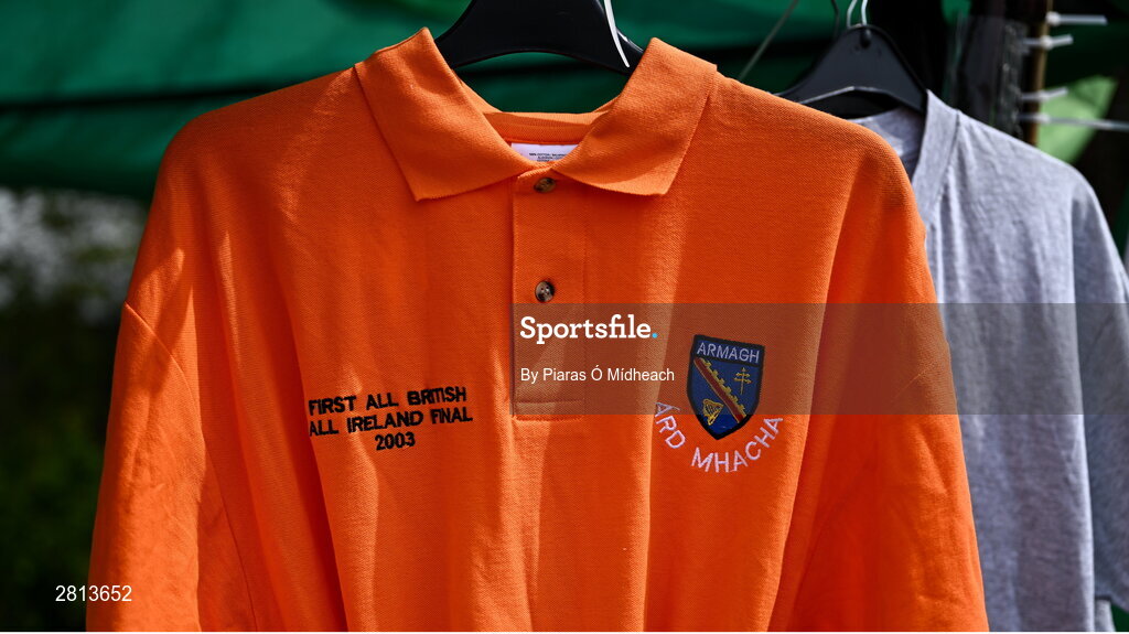 12 May 2024; An unofficial, and unsold, Armagh t-shirt on sale on a street stall before the Ulster GAA Football Senior Championship final match between Armagh and Donegal at St Tiernach's Park in Clones, Monaghan. Photo by Piaras Ó Mídheach/Sportsfile