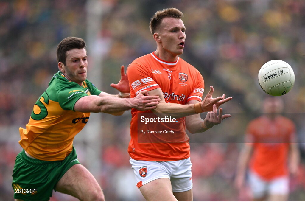 12 May 2024; Rian O'Neill of Armagh in action against Eoghán Bán Gallagher of Donegal during the Ulster GAA Football Senior Championship final match between Armagh and Donegal at St Tiernach's Park in Clones, Monaghan. Photo by Ramsey Cardy/Sportsfile