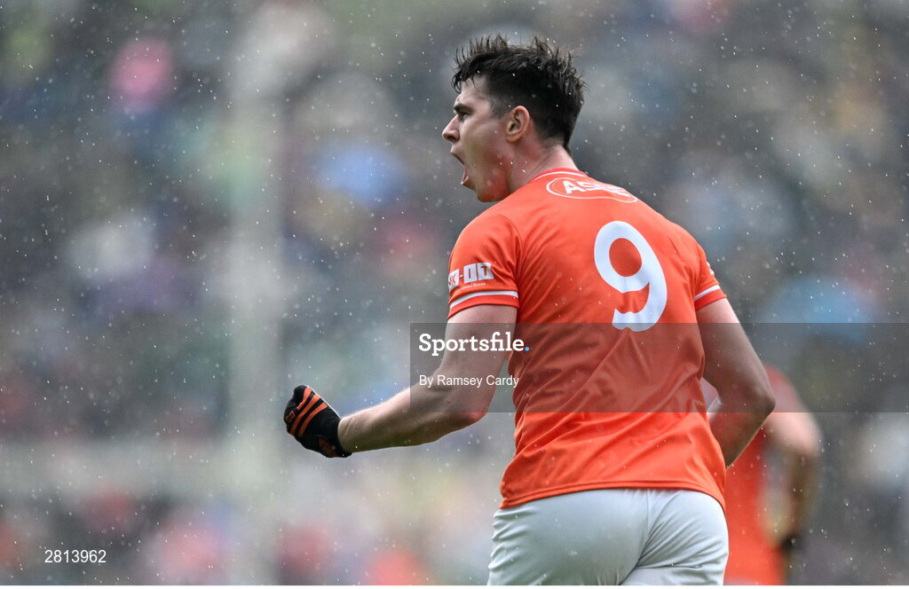 12 May 2024; Ben Crealey of Armagh celebrates after kicking a point during the Ulster GAA Football Senior Championship final match between Armagh and Donegal at St Tiernach's Park in Clones, Monaghan. Photo by Ramsey Cardy/Sportsfile