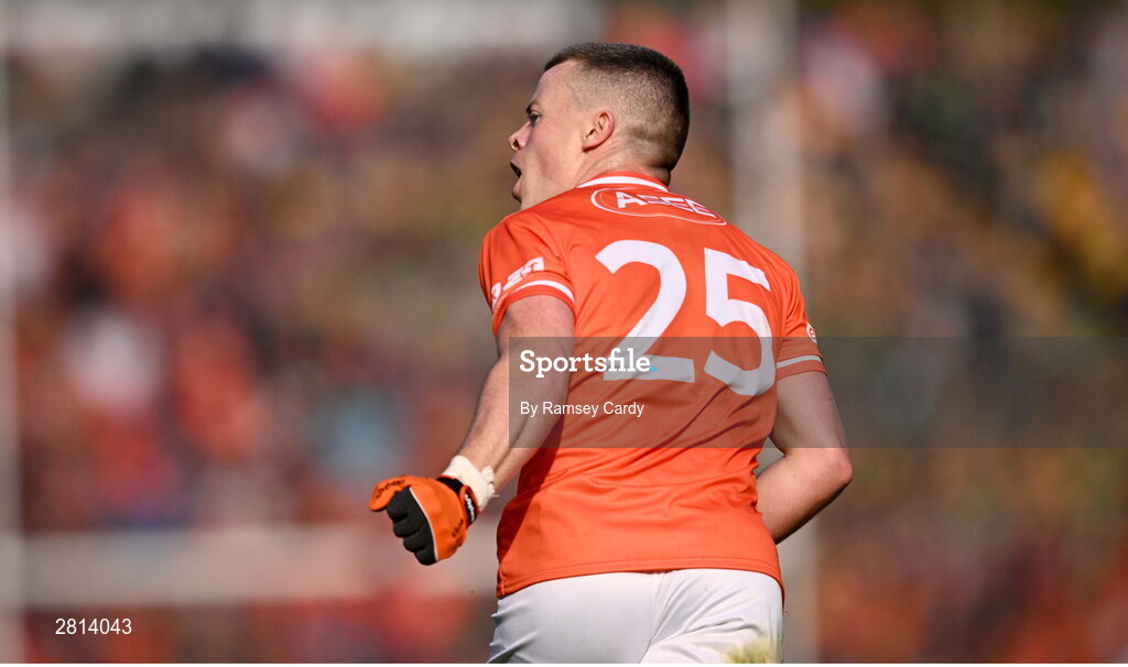 12 May 2024; Aidan Nugent of Armagh celebrates kicking a point during the Ulster GAA Football Senior Championship final match between Armagh and Donegal at St Tiernach's Park in Clones, Monaghan. Photo by Ramsey Cardy/Sportsfile