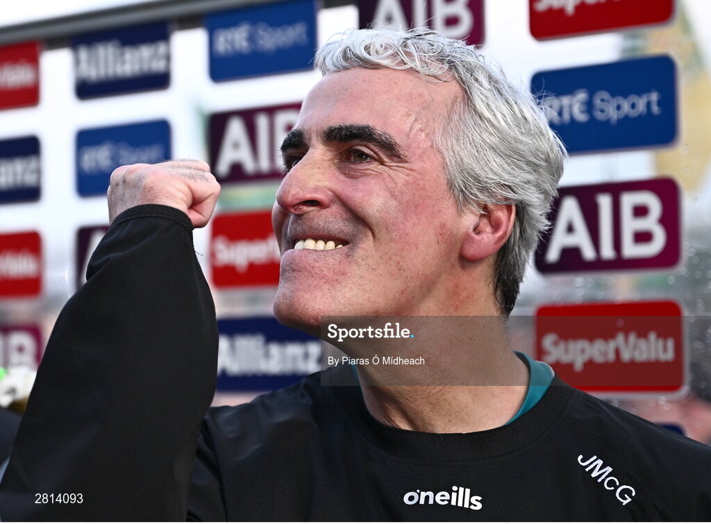 12 May 2024; Donegal manager Jim McGuinness celebrates after his side's victory in the penalty shoot-out of the Ulster GAA Football Senior Championship final match between Armagh and Donegal at St Tiernach's Park in Clones, Monaghan. Photo by Piaras Ó Mídheach/Sportsfile
