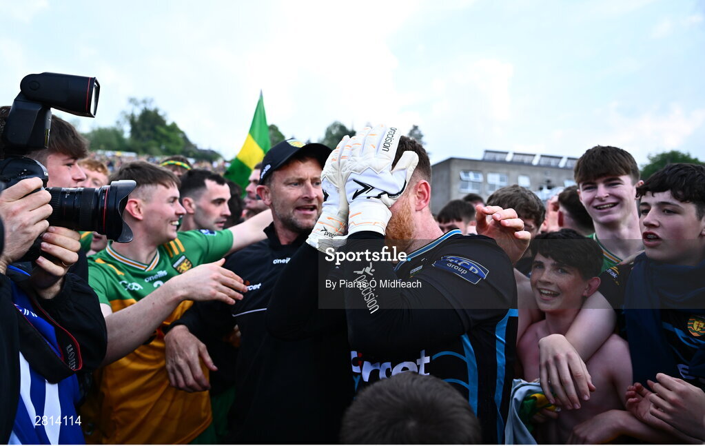 12 May 2024; Donegal goalkeeper Shaun Patton celebrates after saving the final penalty, from Shane McPartlan of Armagh, in the penalty shoot-out of the Ulster GAA Football Senior Championship final match between Armagh and Donegal at St Tiernach's Park in Clones, Monaghan. Photo by Piaras Ó Mídheach/Sportsfile
