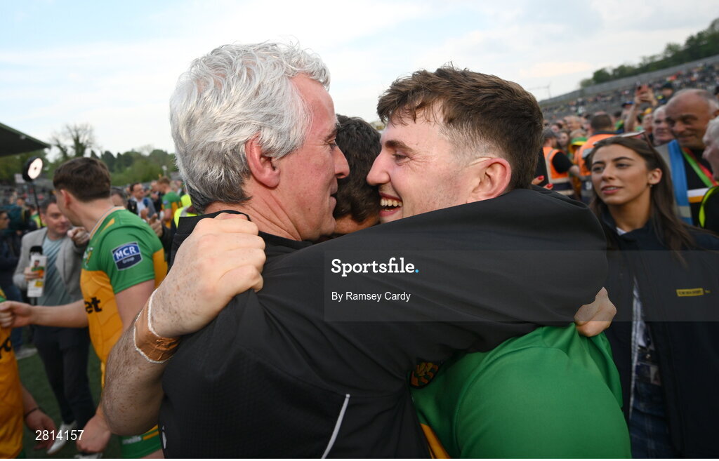 12 May 2024; Donegal manager Jim McGuinness celebrates with Niall O Donnell after the Ulster GAA Football Senior Championship final match between Armagh and Donegal at St Tiernach's Park in Clones, Monaghan. Photo by Ramsey Cardy/Sportsfile