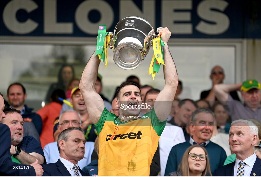 12 May 2024; Caolan McGonagle of Donegal lifts the Anglo Celt Cup the Ulster GAA Football Senior Championship final match between Armagh and Donegal at St Tiernach's Park in Clones, Monaghan. Photo by Ramsey Cardy/Sportsfile