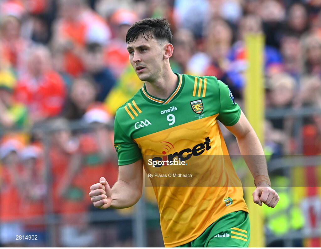 12 May 2024; Michael Langan of Donegal after scoring a penalty in the penalty shoot-out of the Ulster GAA Football Senior Championship final match between Armagh and Donegal at St Tiernach's Park in Clones, Monaghan. Photo by Piaras Ó Mídheach/Sportsfile