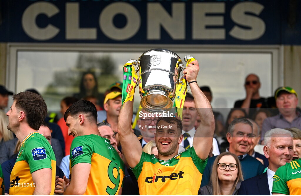 12 May 2024; Stephen McMenamin of Donegal lifts the Anglo Celt Cup after the Ulster GAA Football Senior Championship final match between Armagh and Donegal at St Tiernach's Park in Clones, Monaghan. Photo by Ramsey Cardy/Sportsfile