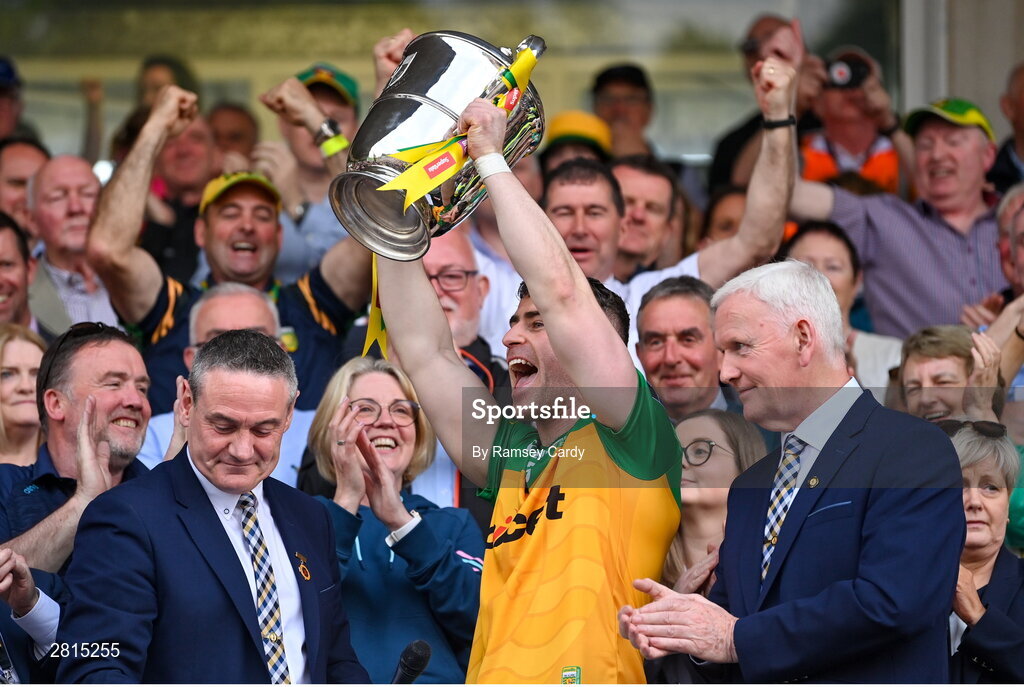 12 May 2024; Donegal captain Patrick McBrearty lifts the Anglo Celt Cup after the Ulster GAA Football Senior Championship final match between Armagh and Donegal at St Tiernach's Park in Clones, Monaghan. Photo by Ramsey Cardy/Sportsfile