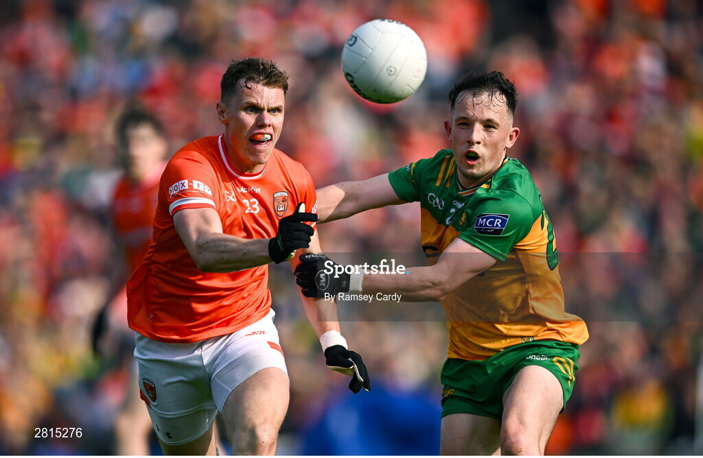 12 May 2024; Oisin O'Neill of Armagh in action against Aaron Doherty of Donegal during the Ulster GAA Football Senior Championship final match between Armagh and Donegal at St Tiernach's Park in Clones, Monaghan. Photo by Ramsey Cardy/Sportsfile