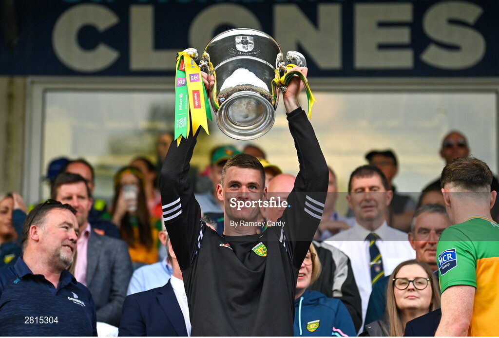 12 May 2024; Caolan Ward of Donegal lifts the Anglo Celt Cup after the Ulster GAA Football Senior Championship final match between Armagh and Donegal at St Tiernach's Park in Clones, Monaghan. Photo by Ramsey Cardy/Sportsfile