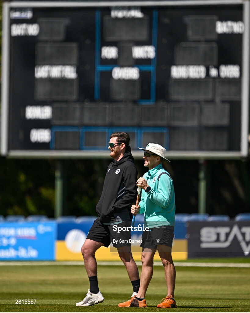 14 May 2024; Ireland head coach Heinrich Malan, right, and Mark Adair of Ireland in conversation before match three of the Floki Men's T20 International Series between Ireland and Pakistan at Castle Avenue Cricket Ground in Dublin. Photo by Sam Barnes/Sportsfile