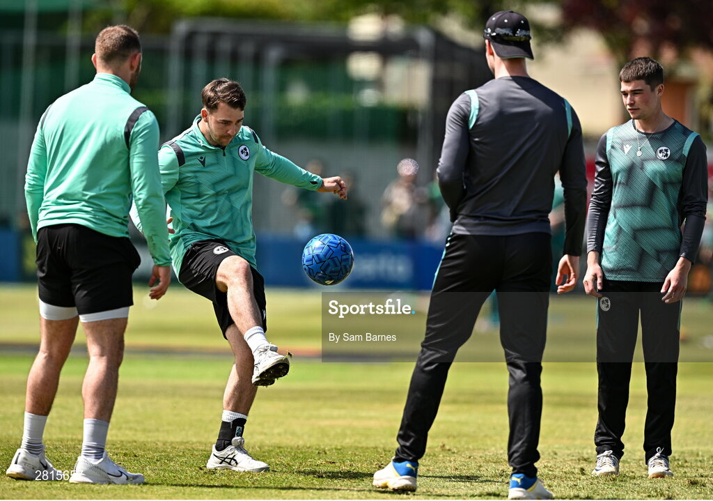 14 May 2024; Ireland players, including Curtis Campher, second from left, warm up before match three of the Floki Men's T20 International Series between Ireland and Pakistan at Castle Avenue Cricket Ground in Dublin. Photo by Sam Barnes/Sportsfile