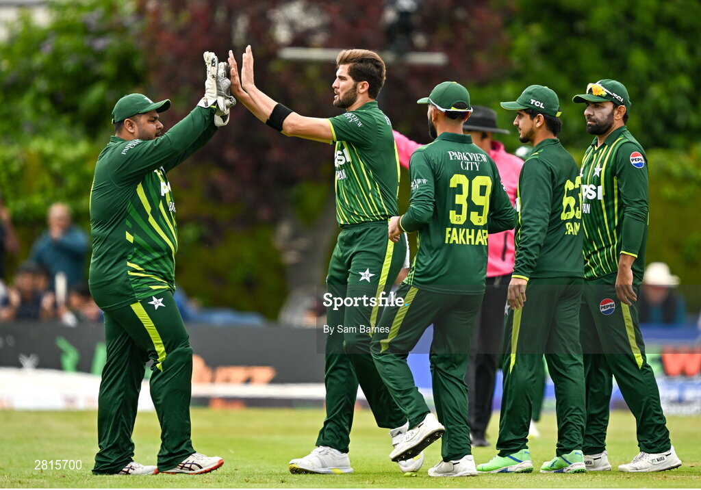 14 May 2024; Shaheen Shah Afridi of Pakistan, second from left, celebrates with team-mates after bowling Ross Adair of Ireland during match three of the Floki Men's T20 International Series between Ireland and Pakistan at Castle Avenue Cricket Ground in Dublin. Photo by Sam Barnes/Sportsfile