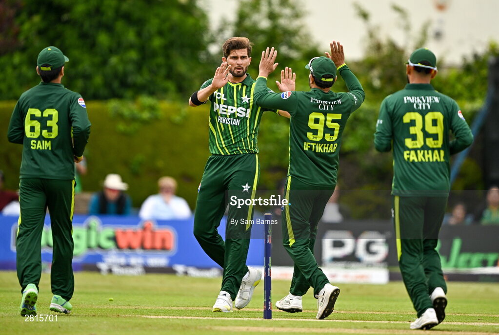 14 May 2024; Shaheen Shah Afridi of Pakistan, second from left, celebrates with team-mates after bowling Ross Adair of Ireland during match three of the Floki Men's T20 International Series between Ireland and Pakistan at Castle Avenue Cricket Ground in Dublin. Photo by Sam Barnes/Sportsfile