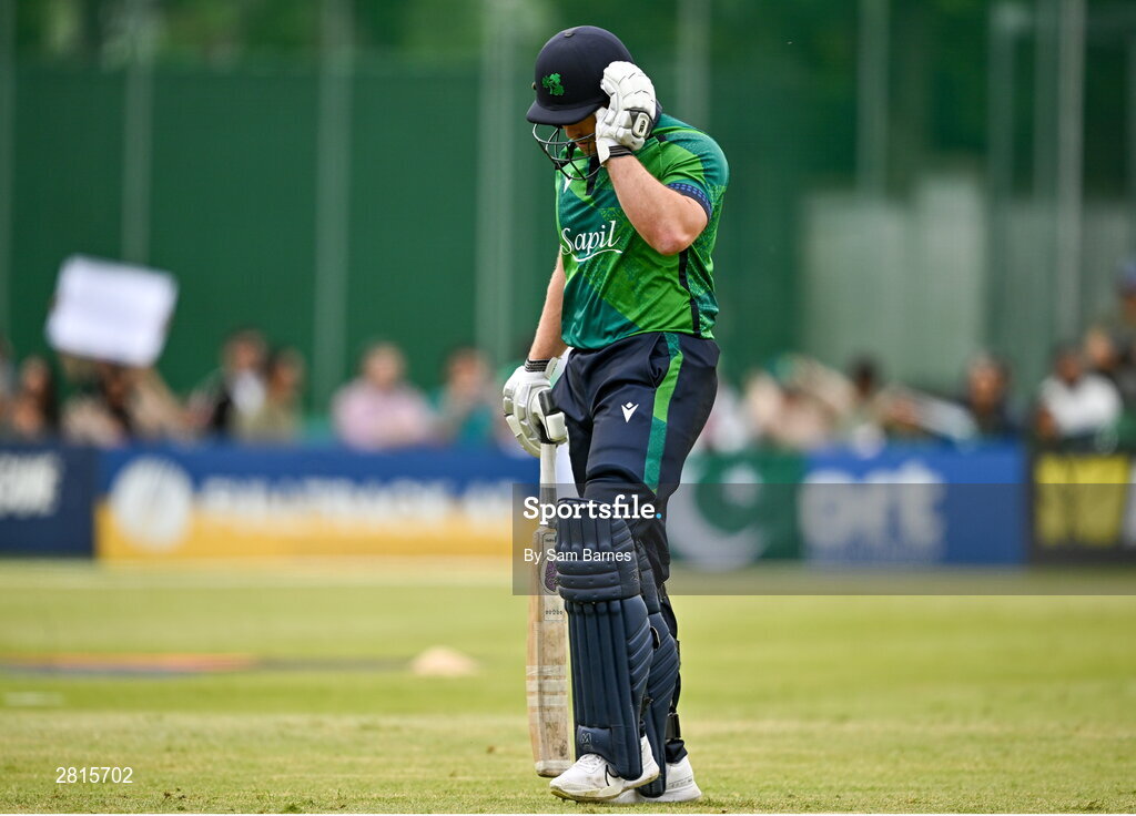 14 May 2024; Ross Adair of Ireland departs the field after being bowled by Shaheen Shah Afridi of Pakistan during match three of the Floki Men's T20 International Series between Ireland and Pakistan at Castle Avenue Cricket Ground in Dublin. Photo by Sam Barnes/Sportsfile
