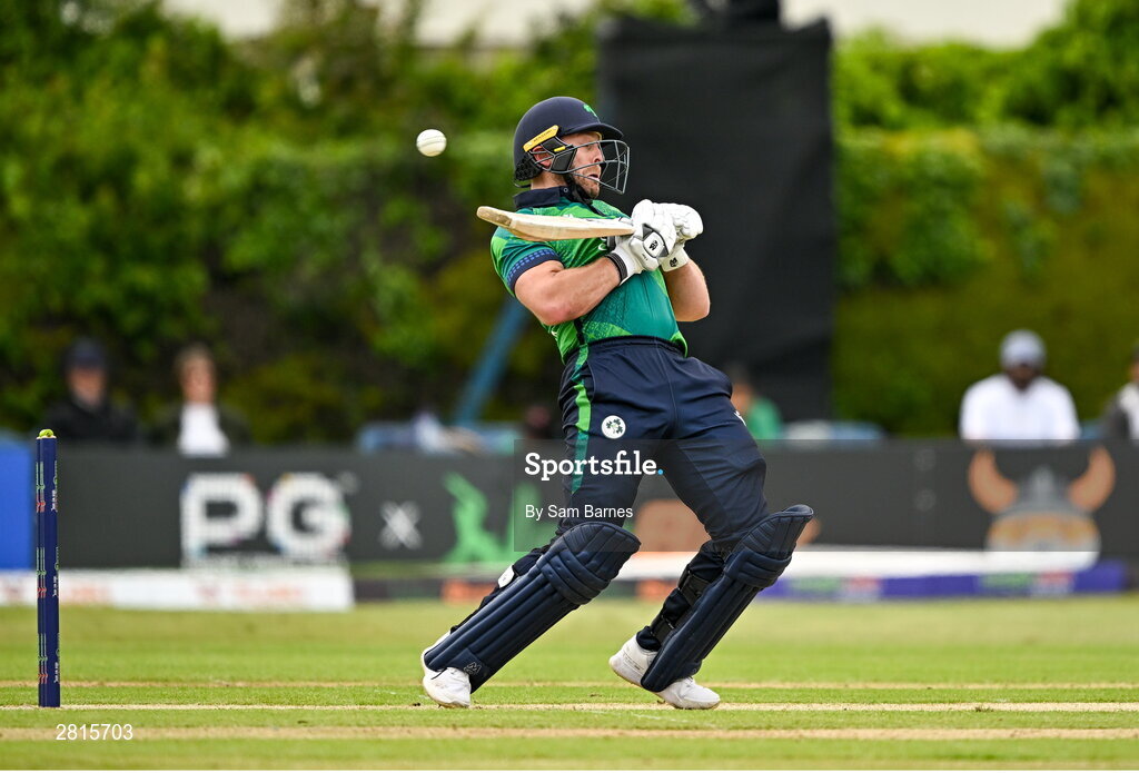 14 May 2024; Ross Adair of Ireland takes evasive action during match three of the Floki Men's T20 International Series between Ireland and Pakistan at Castle Avenue Cricket Ground in Dublin. Photo by Sam Barnes/Sportsfile