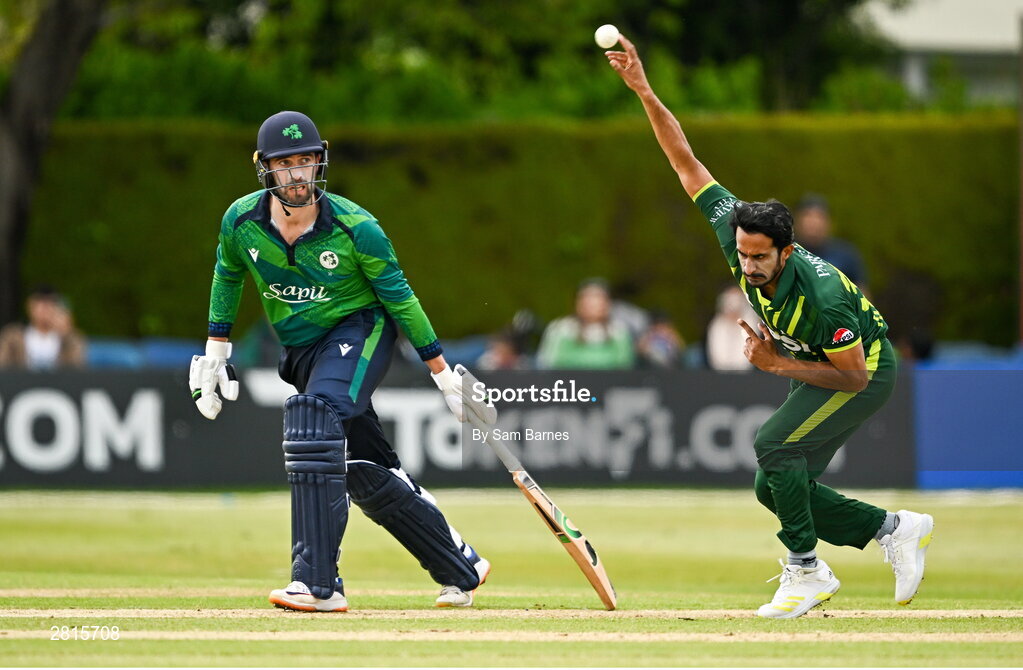 14 May 2024; Hasan Ali of Pakistan bowls watched by Andrew Balbirnie of Ireland during match three of the Floki Men's T20 International Series between Ireland and Pakistan at Castle Avenue Cricket Ground in Dublin. Photo by Sam Barnes/Sportsfile