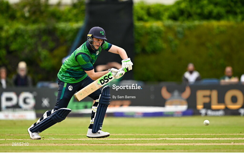 14 May 2024; Lorcan Tucker of Ireland bats during match three of the Floki Men's T20 International Series between Ireland and Pakistan at Castle Avenue Cricket Ground in Dublin. Photo by Sam Barnes/Sportsfile