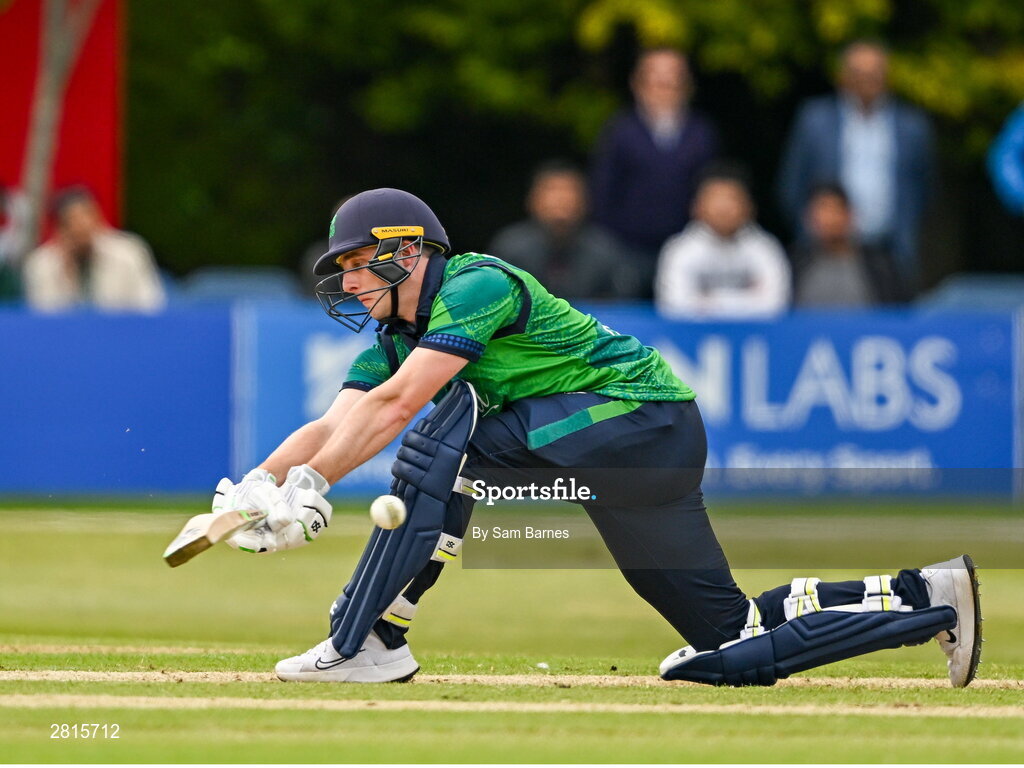 14 May 2024; Lorcan Tucker of Ireland bats during match three of the Floki Men's T20 International Series between Ireland and Pakistan at Castle Avenue Cricket Ground in Dublin. Photo by Sam Barnes/Sportsfile