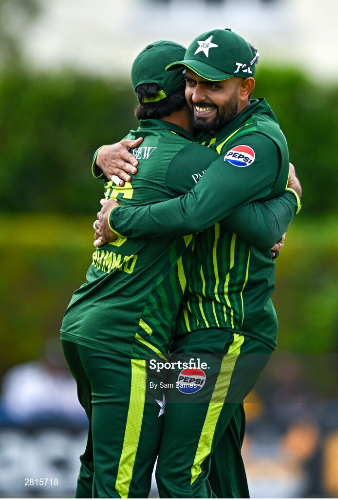 14 May 2024; Mohammad Rizwan of Pakistan, left, and team-mate Babar Azam celebrate the wicket of Andrew Balbirnie of Ireland during match three of the Floki Men's T20 International Series between Ireland and Pakistan at Castle Avenue Cricket Ground in Dublin. Photo by Sam Barnes/Sportsfile