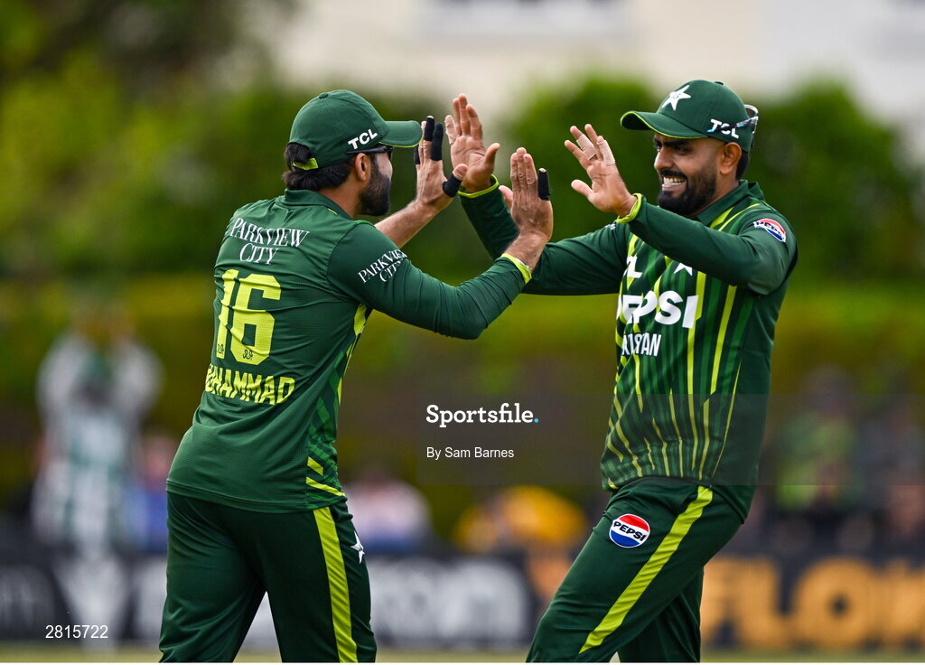 14 May 2024; Mohammad Rizwan of Pakistan, left, and team-mate Babar Azam celebrate the wicket of Andrew Balbirnie of Ireland during match three of the Floki Men's T20 International Series between Ireland and Pakistan at Castle Avenue Cricket Ground in Dublin. Photo by Sam Barnes/Sportsfile
