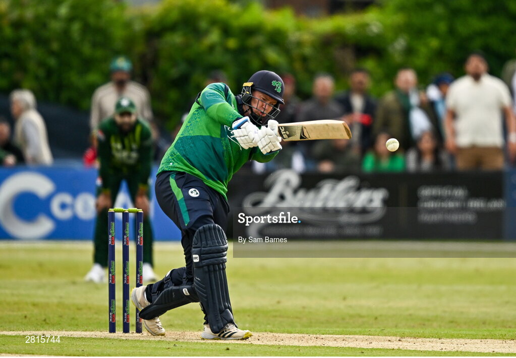 14 May 2024; Graham Hume of Ireland bats during match three of the Floki Men's T20 International Series between Ireland and Pakistan at Castle Avenue Cricket Ground in Dublin. Photo by Sam Barnes/Sportsfile