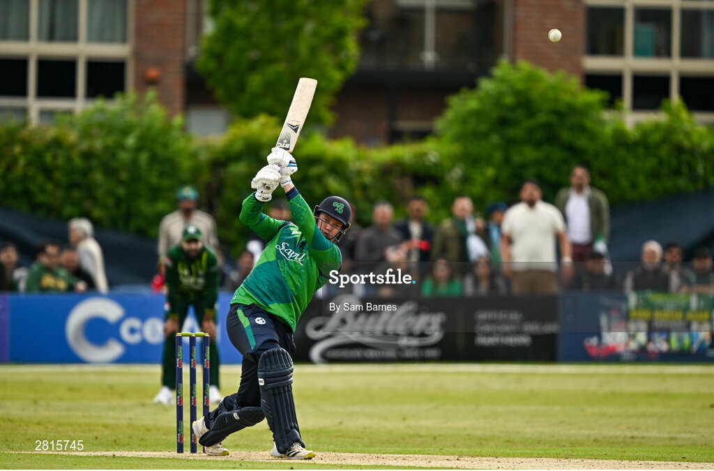 14 May 2024; Graham Hume of Ireland bats during match three of the Floki Men's T20 International Series between Ireland and Pakistan at Castle Avenue Cricket Ground in Dublin. Photo by Sam Barnes/Sportsfile