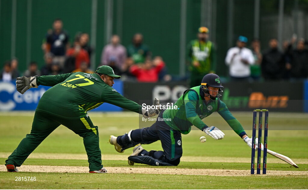 14 May 2024; Azam Khan of Pakistan attempts to run out Graham Hume of Ireland during match three of the Floki Men's T20 International Series between Ireland and Pakistan at Castle Avenue Cricket Ground in Dublin. Photo by Sam Barnes/Sportsfile