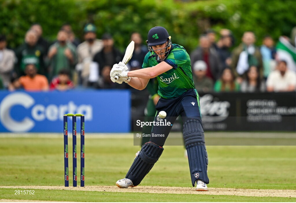 14 May 2024; Harry Tector of Ireland bats during match three of the Floki Men's T20 International Series between Ireland and Pakistan at Castle Avenue Cricket Ground in Dublin. Photo by Sam Barnes/Sportsfile