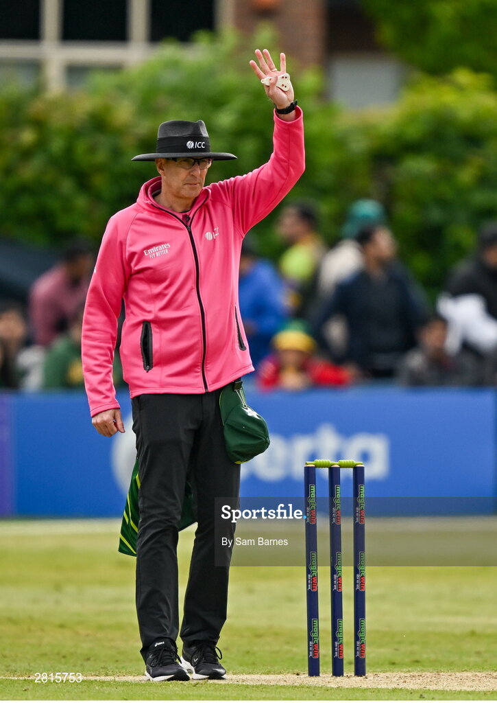 14 May 2024; Umpire Roly Black during match three of the Floki Men's T20 International Series between Ireland and Pakistan at Castle Avenue Cricket Ground in Dublin. Photo by Sam Barnes/Sportsfile
