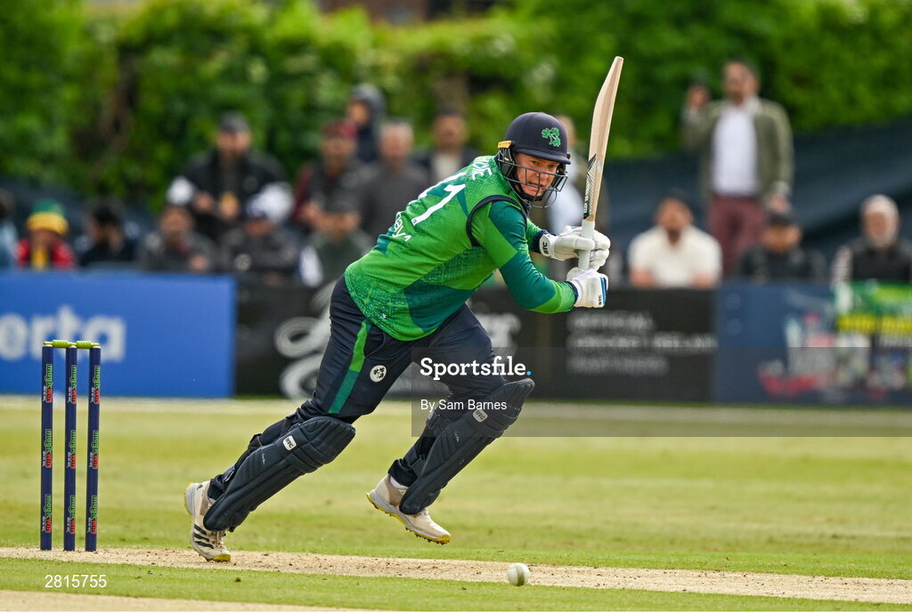 14 May 2024; Graham Hume of Ireland bats during match three of the Floki Men's T20 International Series between Ireland and Pakistan at Castle Avenue Cricket Ground in Dublin. Photo by Sam Barnes/Sportsfile