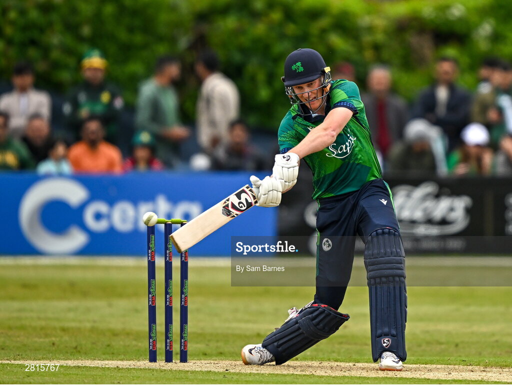 14 May 2024; Harry Tector of Ireland bats during match three of the Floki Men's T20 International Series between Ireland and Pakistan at Castle Avenue Cricket Ground in Dublin. Photo by Sam Barnes/Sportsfile