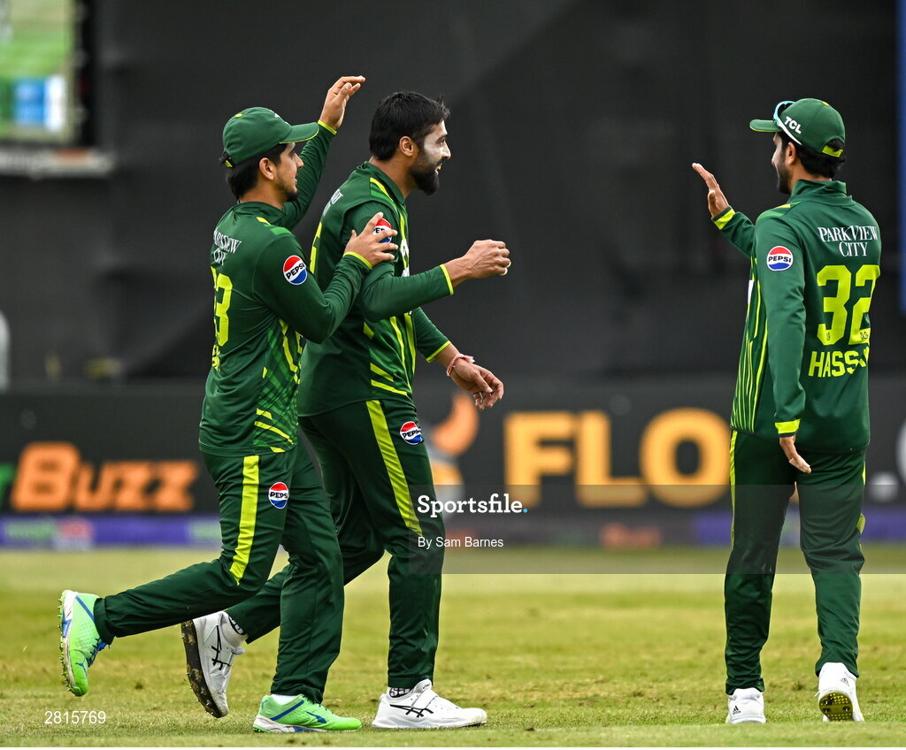 14 May 2024; Mohammad Amir of Pakistan, celebrates with team-mates Saim Ayub, left, and Hasan Ali after catching out George Dockrell of Ireland during match three of the Floki Men's T20 International Series between Ireland and Pakistan at Castle Avenue Cricket Ground in Dublin. Photo by Sam Barnes/Sportsfile