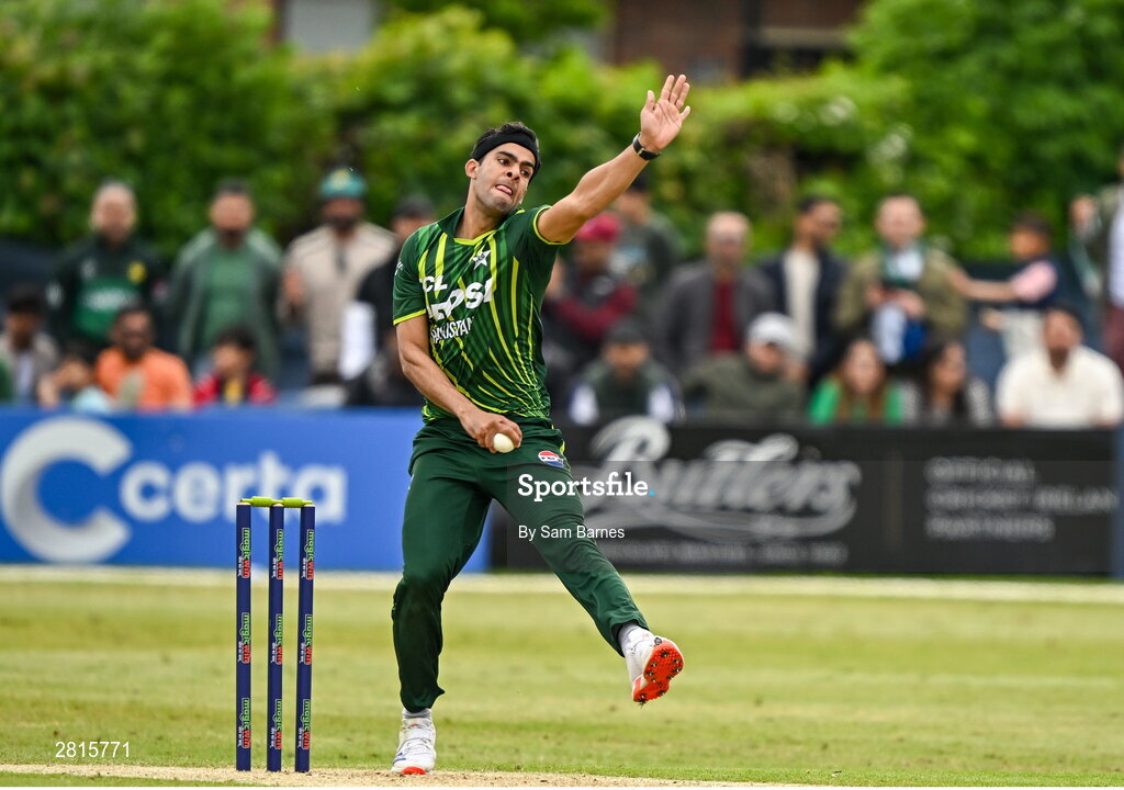 14 May 2024; Abbas Afridi of Pakistan bowls during match three of the Floki Men's T20 International Series between Ireland and Pakistan at Castle Avenue Cricket Ground in Dublin. Photo by Sam Barnes/Sportsfile