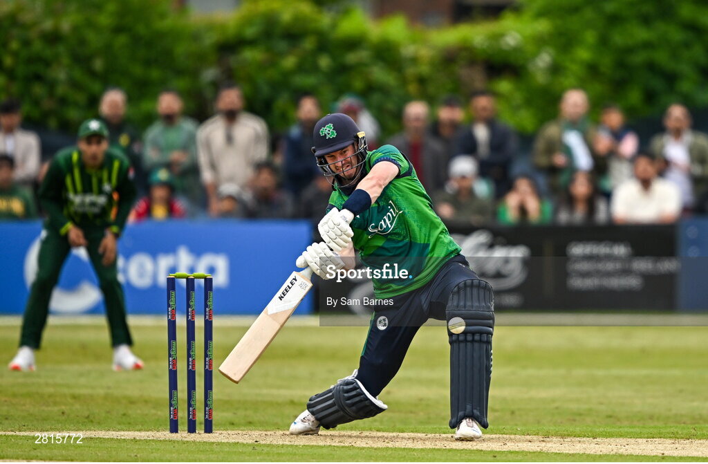 14 May 2024; George Dockrell of Ireland bats during match three of the Floki Men's T20 International Series between Ireland and Pakistan at Castle Avenue Cricket Ground in Dublin. Photo by Sam Barnes/Sportsfile