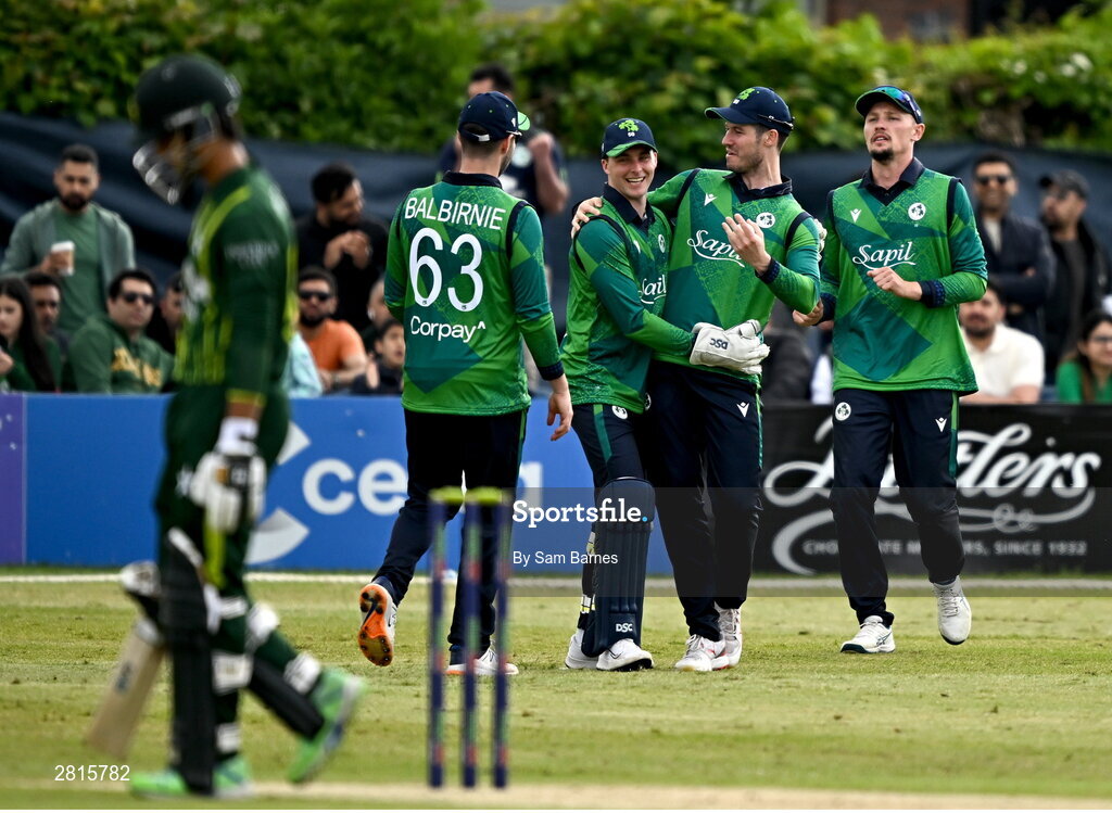 14 May 2024; George Dockrell of Ireland, second from right, celebrates with team-mates including Lorcan Tucker, third from right, after catching out Saim Ayub of Pakistan during match three of the Floki Men's T20 International Series between Ireland and Pakistan at Castle Avenue Cricket Ground in Dublin. Photo by Sam Barnes/Sportsfile