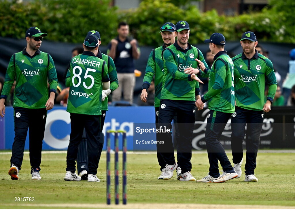 14 May 2024; George Dockrell of Ireland, centre, celebrates with team-mates after catching out Saim Ayub of Pakistan during match three of the Floki Men's T20 International Series between Ireland and Pakistan at Castle Avenue Cricket Ground in Dublin. Photo by Sam Barnes/Sportsfile