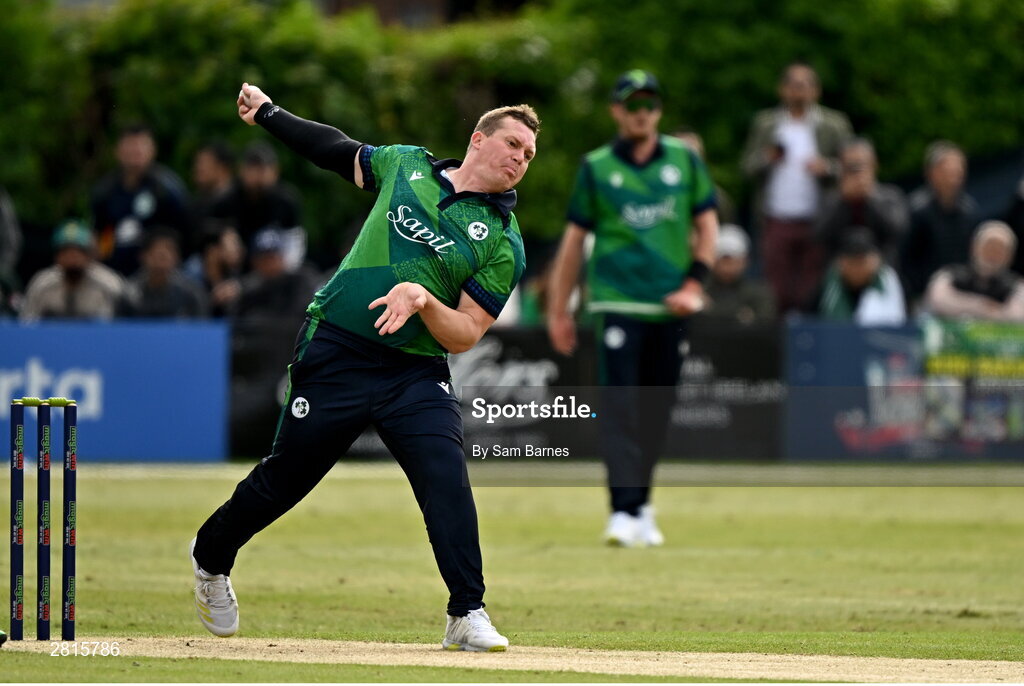 14 May 2024; Graham Hume of Ireland bowls during match three of the Floki Men's T20 International Series between Ireland and Pakistan at Castle Avenue Cricket Ground in Dublin. Photo by Sam Barnes/Sportsfile