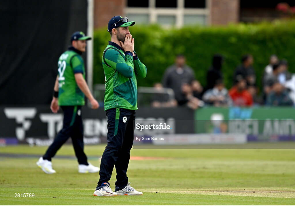 14 May 2024; Andrew Balbirnie of Ireland reacts during match three of the Floki Men's T20 International Series between Ireland and Pakistan at Castle Avenue Cricket Ground in Dublin. Photo by Sam Barnes/Sportsfile