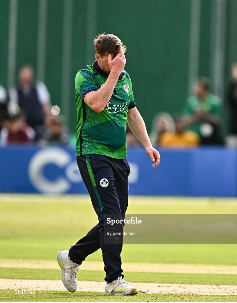 14 May 2024; Craig Young of Ireland reacts during match three of the Floki Men's T20 International Series between Ireland and Pakistan at Castle Avenue Cricket Ground in Dublin. Photo by Sam Barnes/Sportsfile
