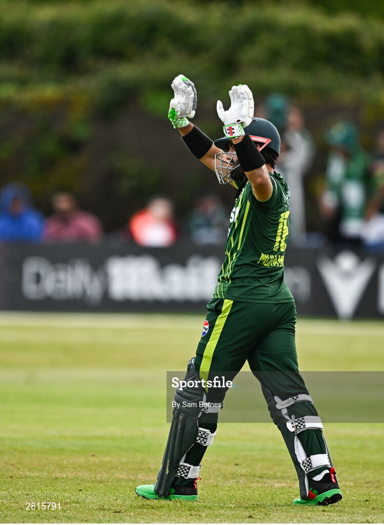14 May 2024; Mohammad Rizwan of Pakistan celebrates after bringing up his half century during match three of the Floki Men's T20 International Series between Ireland and Pakistan at Castle Avenue Cricket Ground in Dublin. Photo by Sam Barnes/Sportsfile
