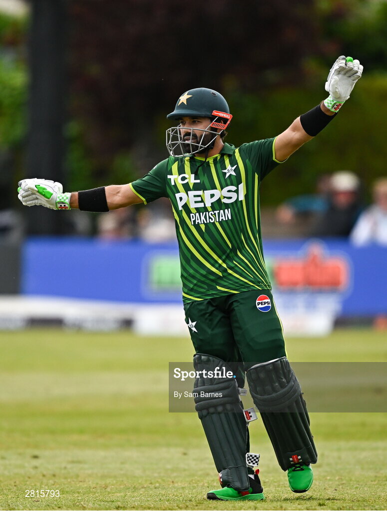 14 May 2024; Mohammad Rizwan of Pakistan celebrates after bringing up his half century during match three of the Floki Men's T20 International Series between Ireland and Pakistan at Castle Avenue Cricket Ground in Dublin. Photo by Sam Barnes/Sportsfile