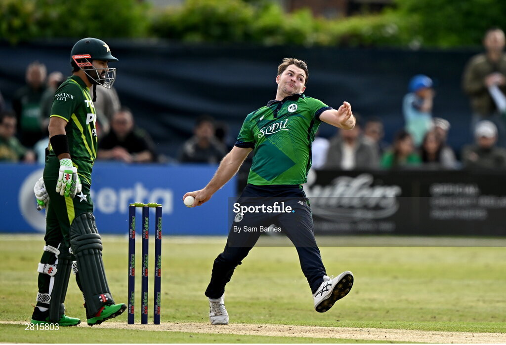 14 May 2024; Curtis Campher of Ireland bowls during match three of the Floki Men's T20 International Series between Ireland and Pakistan at Castle Avenue Cricket Ground in Dublin. Photo by Sam Barnes/Sportsfile