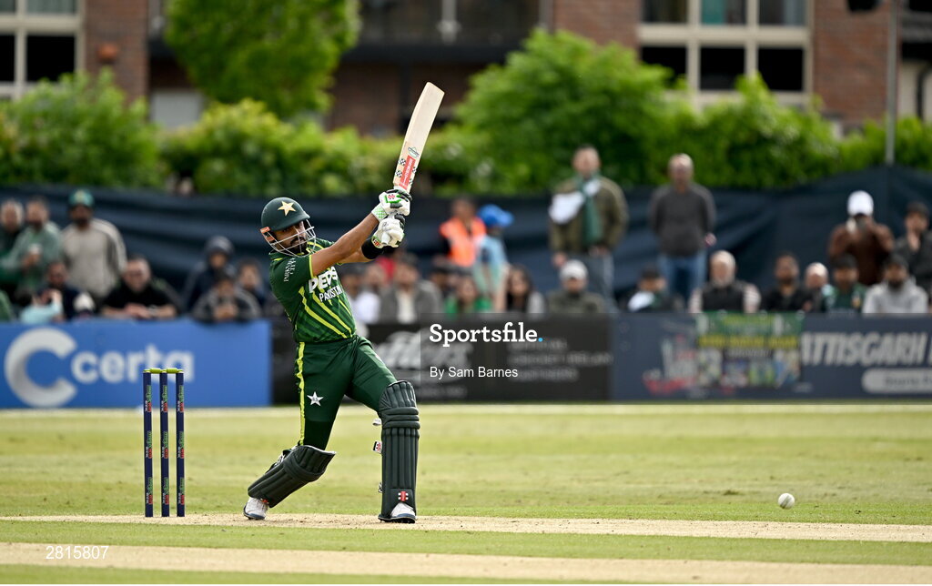 14 May 2024; Babar Azam of Pakistan bats during match three of the Floki Men's T20 International Series between Ireland and Pakistan at Castle Avenue Cricket Ground in Dublin. Photo by Sam Barnes/Sportsfile